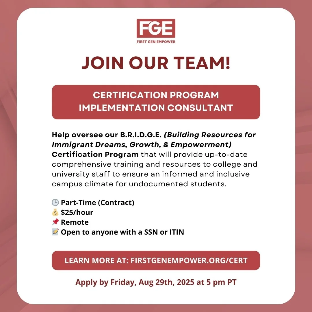 The BRIDGE Certification Program, which stands for Building Resources for Immigrant Dreams, Growth, & Empowerment, will be a 9-session virtual certification course that will provide up-to-date comprehensive training and resources to college and university staff to ensure an informed and inclusive campus climate for undocumented students. This project is being launched by First Gen Empower, in partnership with Presidents’ Alliance and CUNY, to build an ecosystem of support for the nation’s undocumented students who are pursuing–and graduating from–higher education.