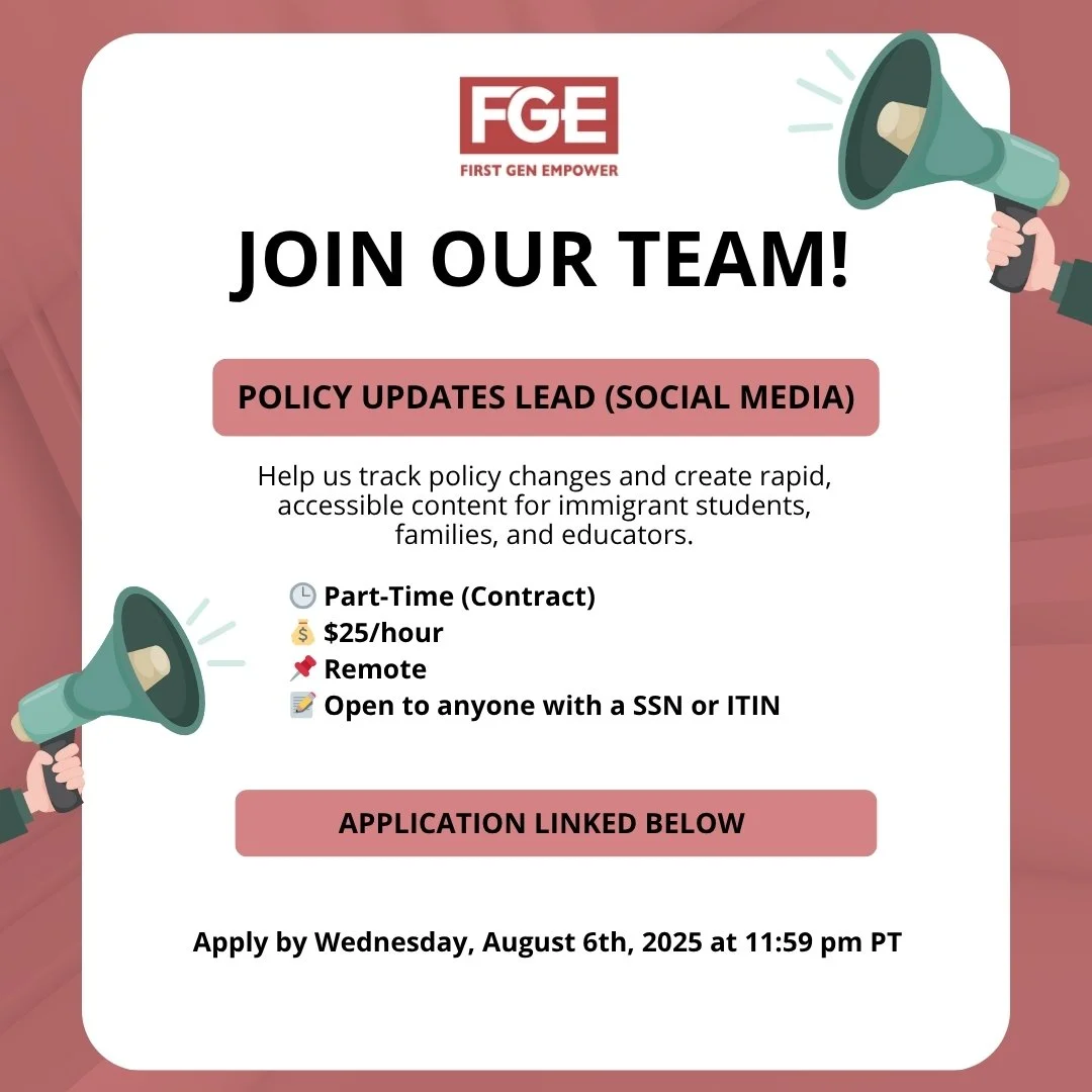 We’re looking for someone to join our team! We are hiring for a Policy Updates Lead who can stay on top of current immigration and education policies and help us translate that information into helpful guidance and content for educators and immigrant students.